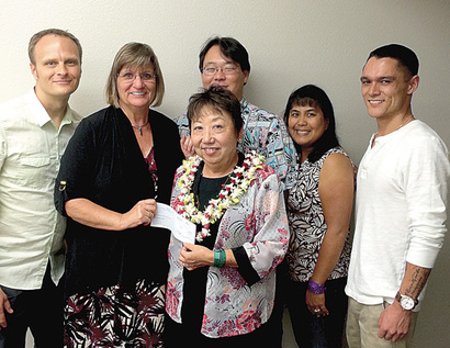 Photo - Lahaina News. From left, Feed My Sheep Operations Director Scott Hopkinson and CEO Joyce Kawakami accept the check from Susan Hiramatsu, Hawaiian Ceramic Tile manager; Corey Egami, Hawaiian Carpet One manager; Wanda Barbosa, office manager; and Kekoa Kawakami of Hawaiian Ceramic Tile.
