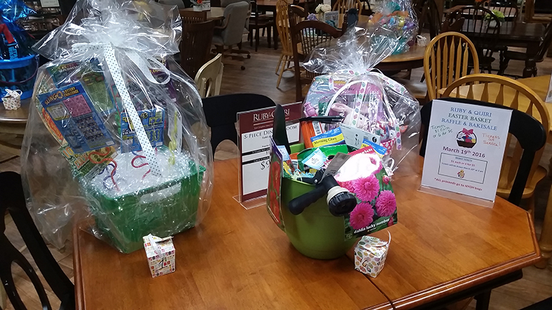 The baskets consist of hats, booties, and scarves because sometimes when you are undergoing treatment you get cold. There are also food items that are rich in antioxidants like green tea and dark chocolate. Pens and journals to keep track of your appointments. Deodorant, hand sanitizer, and lotions that are unscented are in there as well. When undergoing treatments sensitivity to smells and dry skin are common. There are people in the community who donate to the bags as well as the staff members of Ruby and Quiri put on bake sales and raffles to generate funds for the bags.