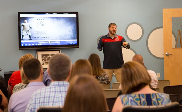 On Wednesday, August 26th, the Carpet One office in Manchester, NH had the pleasure of receiving a surprise visit from none other than SSG Travis Mills! Travis stopped by to say hello and to update us on the exciting things he and his family have been up to since moving into their smart home in Maine last year.