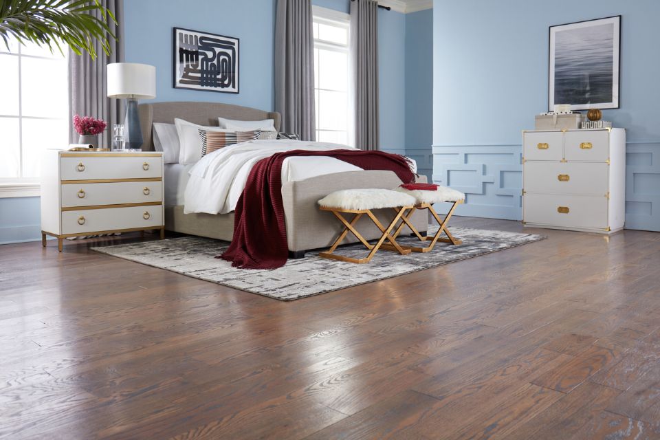 Laminate flooring remains a popular choice thanks to its natural-looking grains and rich red and golden tones. It beautifully replicates the appearance of woods like red and white oak while offering durability and easy maintenance. Many wood-look laminate options are also water-resistant, providing added peace of mind. This timeless flooring serves as a versatile foundation, making it a great fit for practically any room in your home.