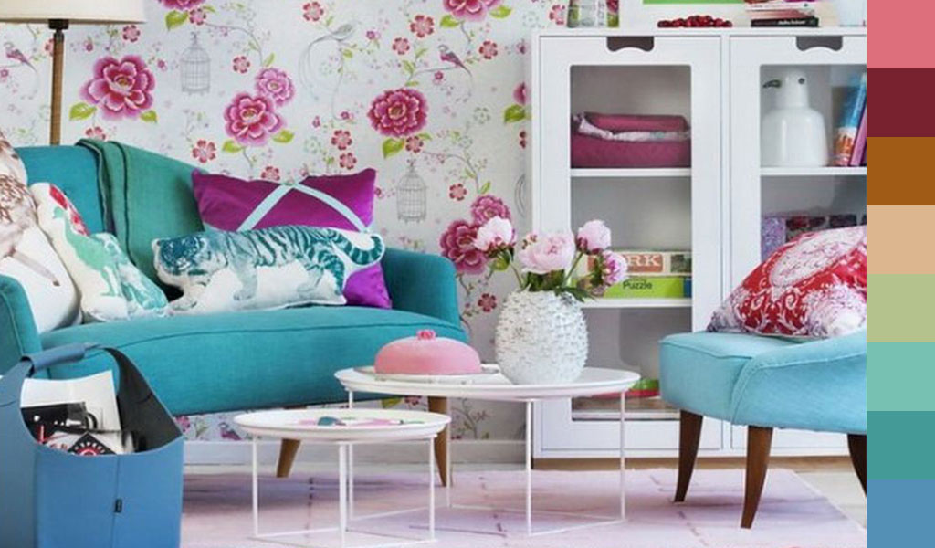 Inspiration image from Kepoon - Home Design Inspiration. Pantone colors from top to bottom: 16-1620 Tea Rose, 19-1652 Rhubarb, 18-1163 Pumpkin Spice, 14-1122 Sheepskin, 14-0116 Margarita, 14-5713 Cascade, 17-4919 Teal, and 18-4220 Provincial Blue.