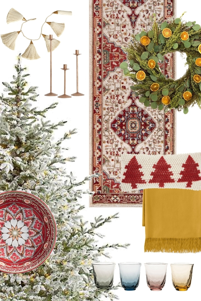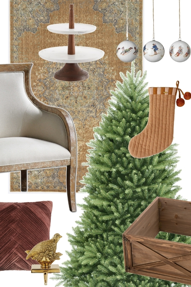 Artificial Christmas Tree: Silverado Slim® Tree by Balsam Hill, Ornaments: Glass Teardrop Ornaments by CB2, Wooden Snowman: Holiday Decoration by Crate&Barrel, Throw Pillow Cover: Alpine Pillow Cover by Arhaus, Armchair: Mid-Century Show Wood Chair by West Elm, Carpet: available at Carpet One Floor & Home, Deer Figurine Set: Mark Roberts by Perigold, Candle Holder: Napa Hurricane Taper Holder by Pottery Barn