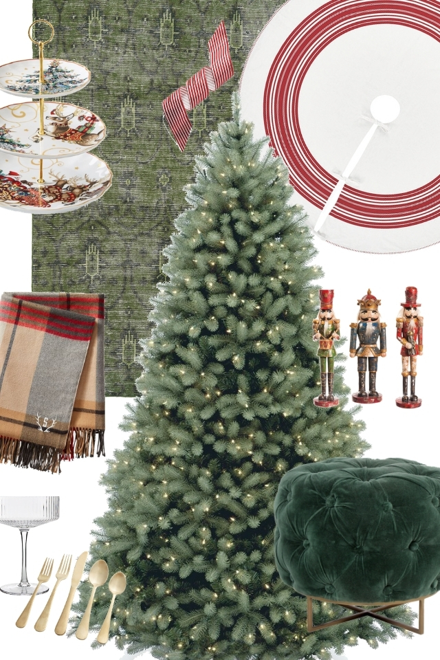 Tree Skirt: Velvet Christmas Tree Skirt by CB2, Luxury Vinyl: Dark Wood-Look Luxury Vinyl available at Carpet One Floor & Home, Drinkware: Marie Coupe Cocktail Glass by CB2, Serving Tray: Amelei Rectangular Tiered Servers by Frontgate, Tree Figurine: Flocked Christmas Tree Figurine by Target, Ottoman: Everywhere Velvet Pouf by Pottery Barn