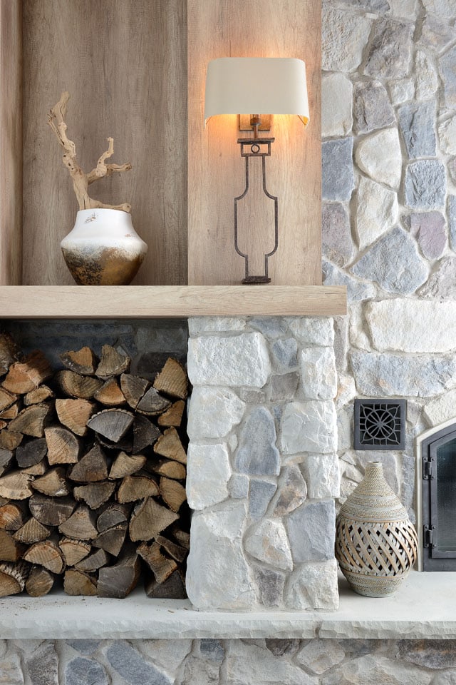 On the homeowners’ wish list as part of this renovation and redesign was a fabulous fireplace feature wall. The goal was to create an architectural feature. Still, it had to fulfill a practical purpose as well––storage for firewood, personal mementos, and entertainment equipment. We achieved the “wow” factor with a dramatic built-in fashion from an Italian laminate product, which offered durability and a wonderfully rustic look. And speaking of fabulous fakes, the fireplace surround is finished in a cultured stone that mimics real stone. The feature wall boasts an asymmetrical look that lends itself to the casual atmosphere.